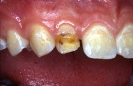 porcelain onlays placed in her own mouth. A crown fits over the entire tooth and is placed when the tooth has large areas of decay, large fillings, or is severely damaged. Crowns can change the color, shape, close gaps, and straighten teeth. When crowns are bonded in place with the argon laser it helps strengthen and protect the remaining tooth structure. Before crowns After crowns